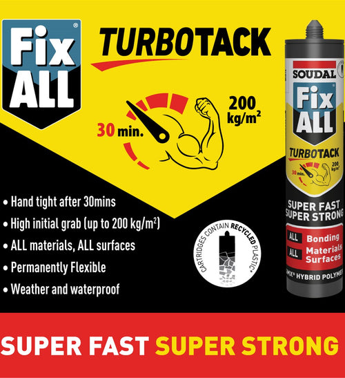 Instant grab. Rock-solid hold. Soudal Fix ALL TurboTack delivers ultra-fast bonding for heavy-duty jobs—no screws, no waiting, just pure adhesive strength.