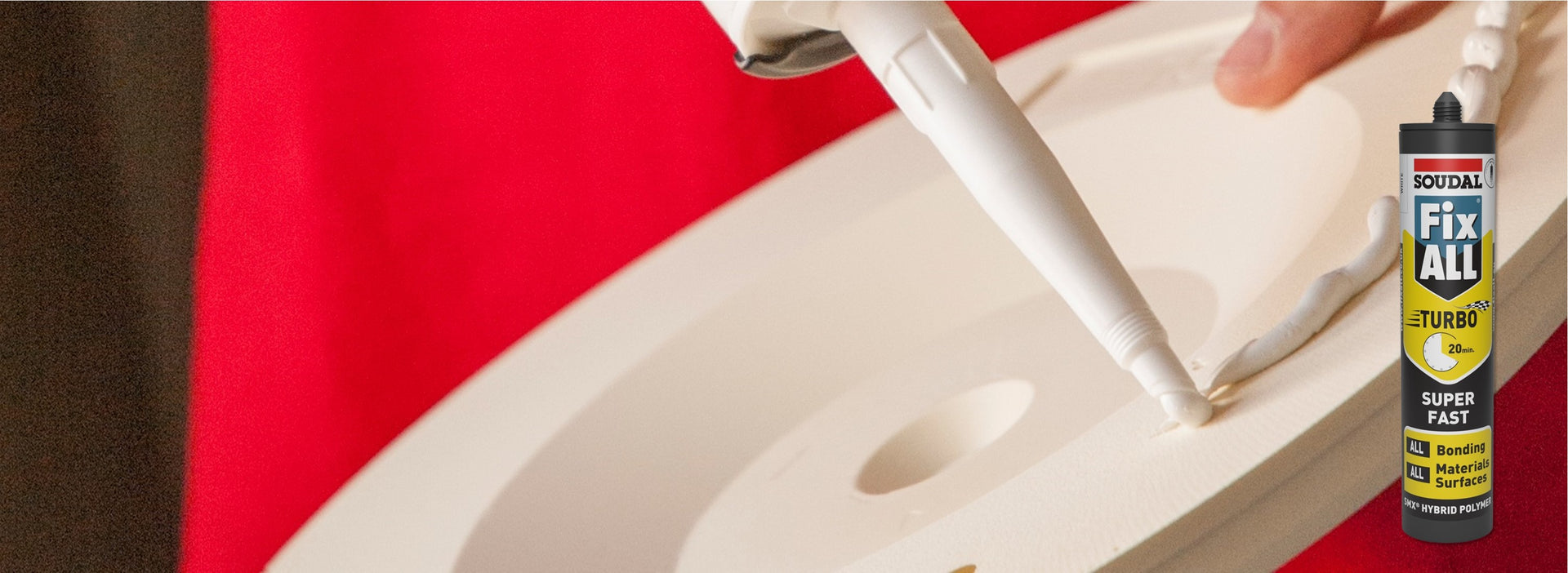 Super fast-setting adhesive for heavy-duty applications, Soudal Fix ALL Turbo offers rapid strength in just 3 hours. Ideal for kitchens, bathrooms, and all-weather bonding, even on damp surfaces, with advanced SMX® Hybrid Polymer technology.