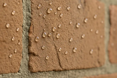 Water beading on brickwork after application of AquaSolve Pro Masonry Waterproofing Cream, demonstrating rain repellency with a natural, unchanged finish.