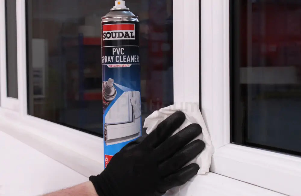A) Soudal PVCu Solvent Spray Cleaner is a professional, solvent based aerosol cleaner designed specifically for white PVCu window and door frames, sills and other hard plastics. It rapidly removes ingrained dirt, atmospheric grime, grease, uncured sealant residues, pencil and pen marks and general site handling marks. The non smearing formula flashes off quickly, leaving a clear, bright and shiny finish without the need for heavy scrubbing. It is ideal for both new installations and refurbishment work where a fast acting cleaner is needed to restore PVCu and compatible plastics to a presentable, “just installed” appearance.