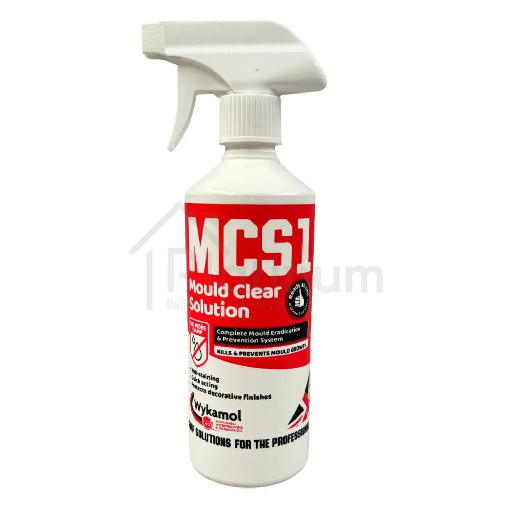 Wykamol MCS1 Mould Clear Solution is a ready-to-use mould treatment supplied in a 500ml spray bottle, designed to eradicate and sterilise black mould growth on a variety of internal surfaces.